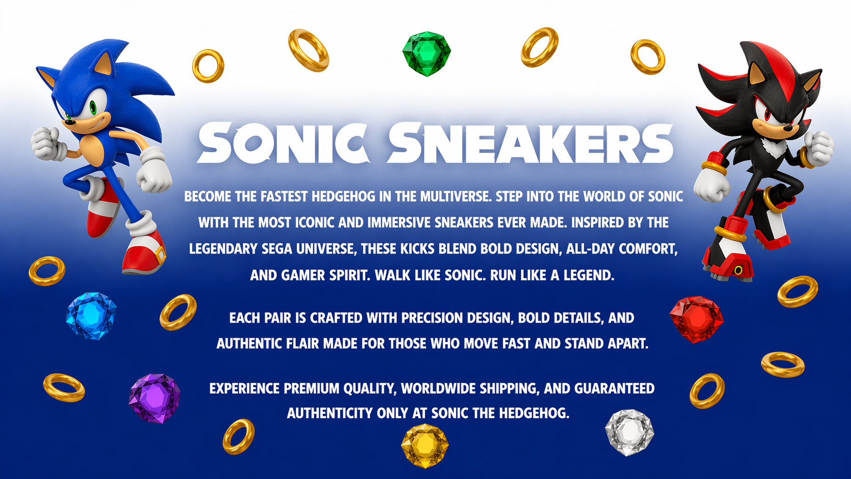 Tired of low-quality shoes that are everywhere? So are we. That's why we decided to do something different, something better. Most shoes you find in stores or online are made from cheap materials like low-grade polyester, which suffocates your feet and loses shape after just a few uses. Not to mention the poor designs and sloppy details that don't do justice to the iconic Sonic the Hedgehog.
