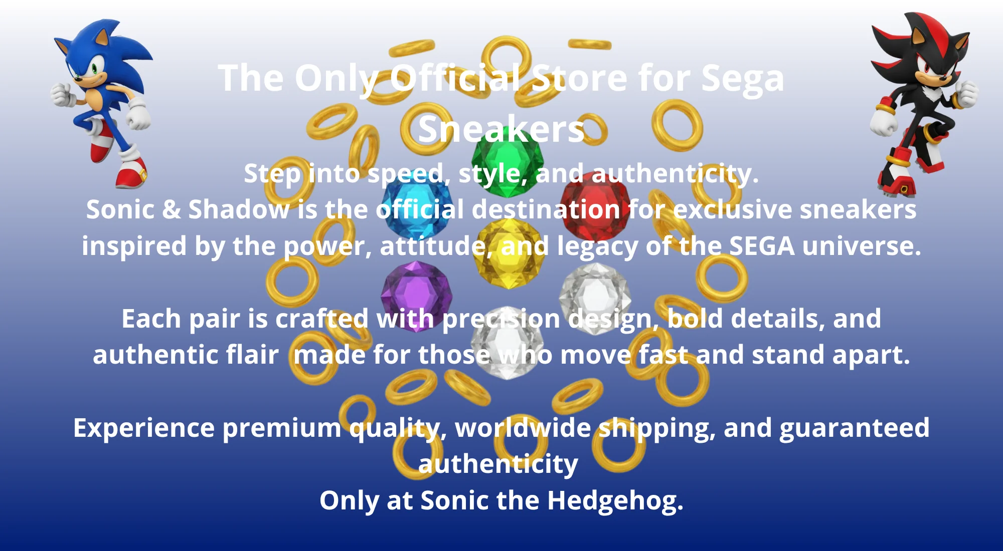 Step into speed, style, and authenticity. Sonic & Shadow is the official destination for exclusive sneakers inspired by the power, attitude, and legacy of the SEGA universe. Each pair is crafted with precision design, bold details, and authentic flair made for those who move fast and stand apart. Experience premium quality, worldwide shipping, and guaranteed authenticity Only at Sonic the Hedgehog.