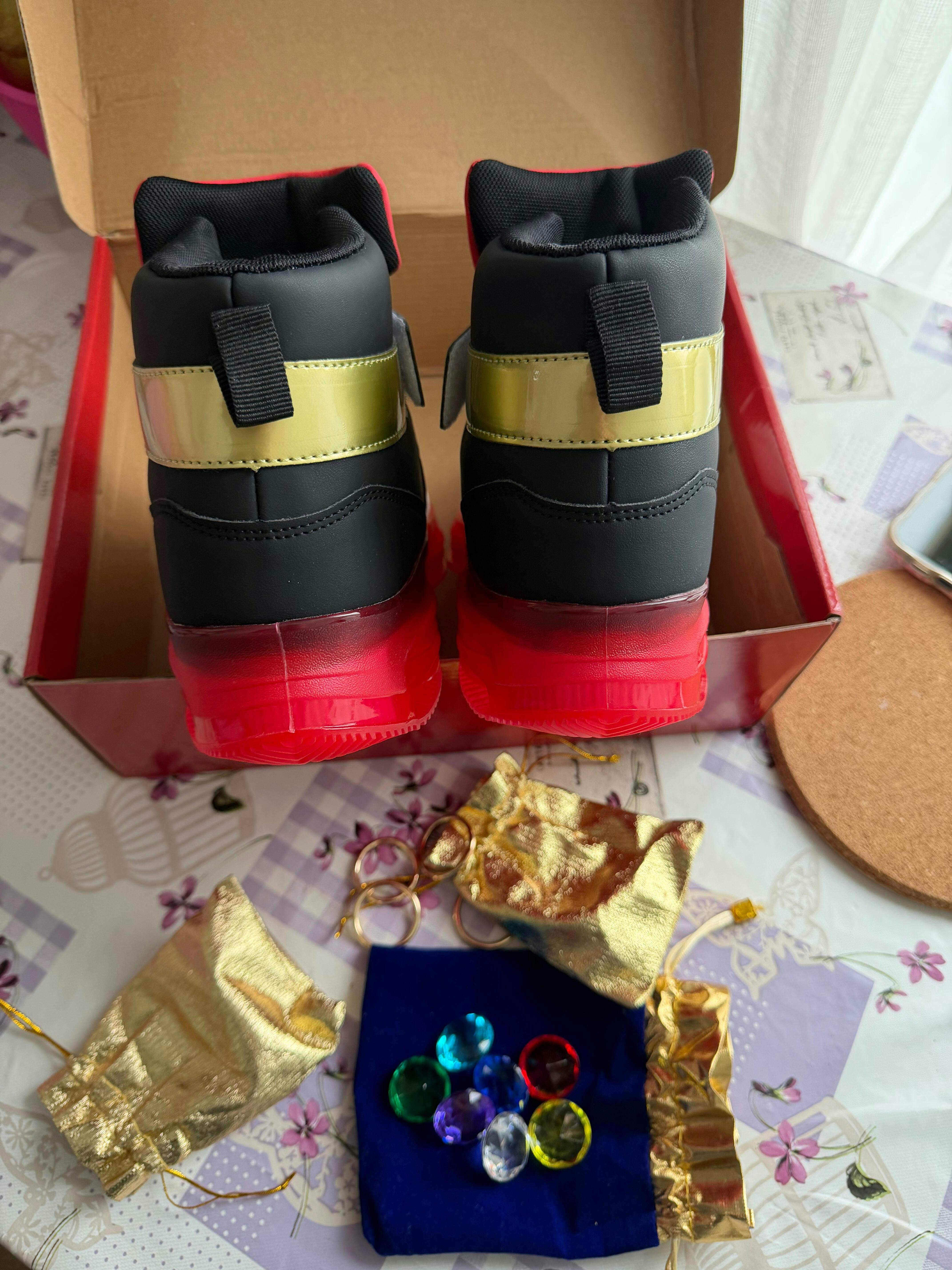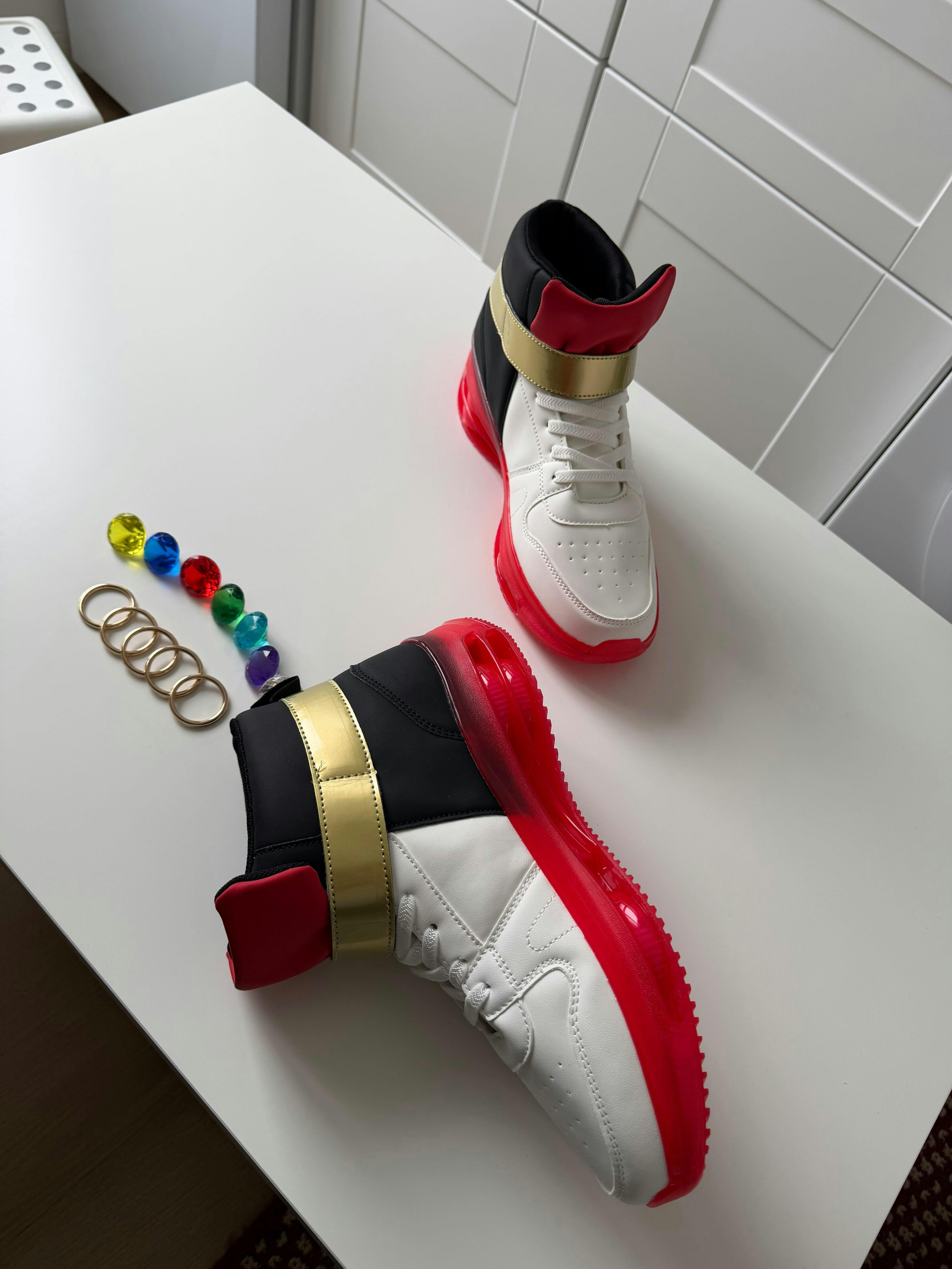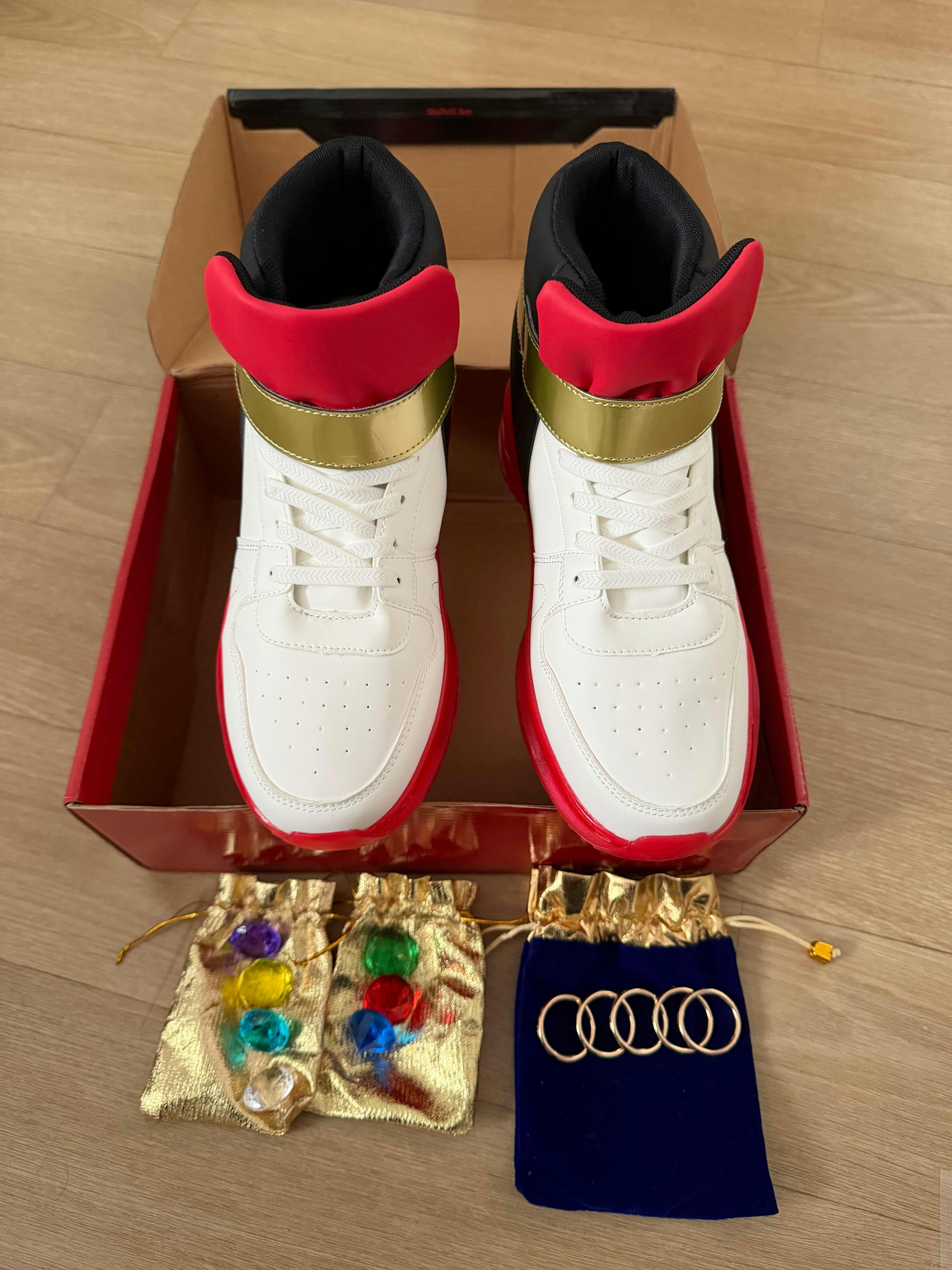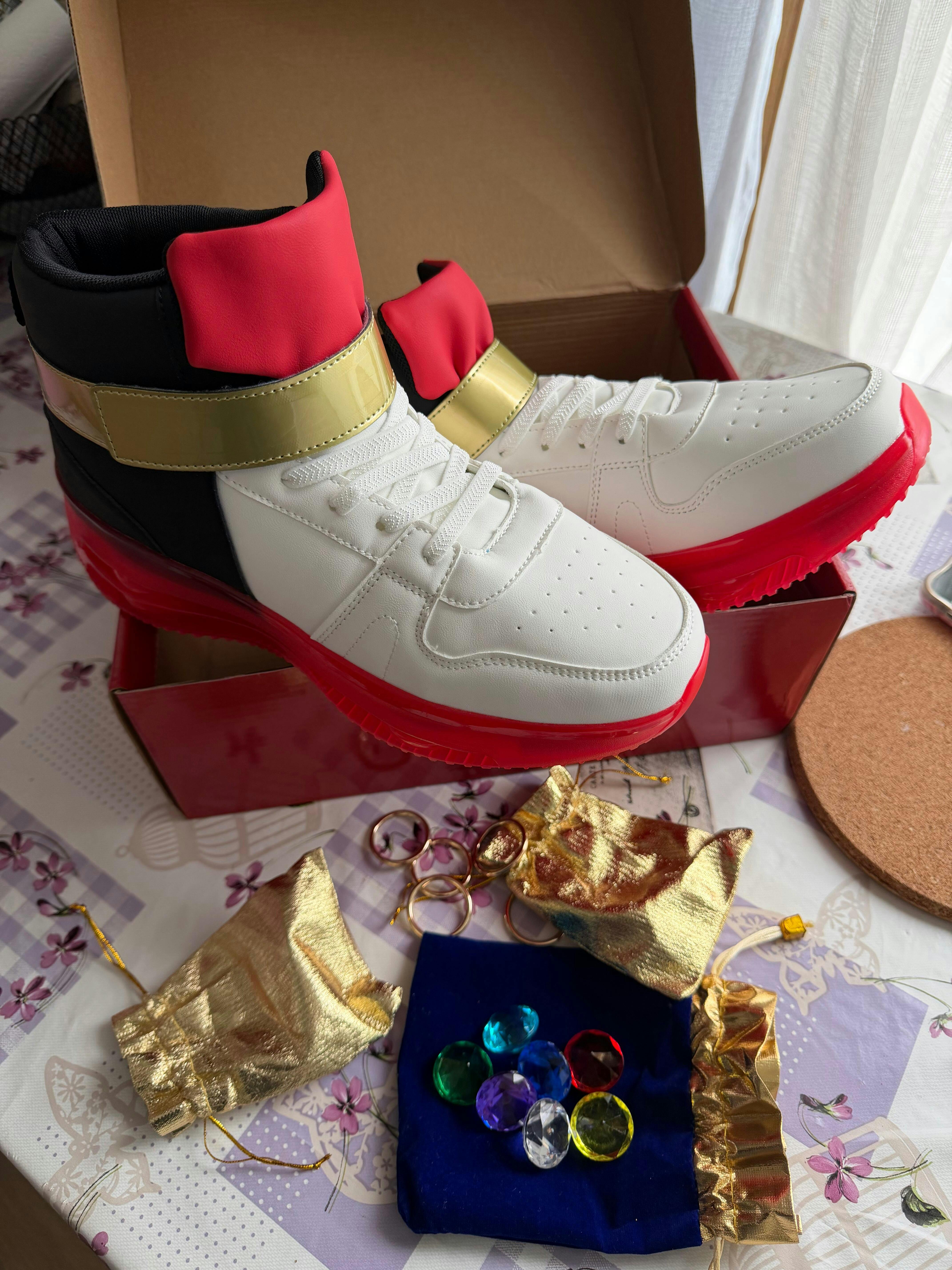 Get ready to sprint in stye with the Sonic Shadow Shoes Rings & Diamonds. Inspired by Sonic the Hedgehog and Shadow, these shoes bring a fun blend of Sonic's speed and Shadow's destruction in a bold red and black tie-dye pattern with accents of white and yellow and hints of gold. The shoes are additional gold rings and chaos diamonds, which represents part of the playful spirit of the characters' world. The colorful patterns and silhouette are perfect for any sonic fan looking to rock some new kicks and show their love for the characters.Whether you are racing across the street or walking a festival, the sneakers will provide energy, nostalgia, and flair in your every step.